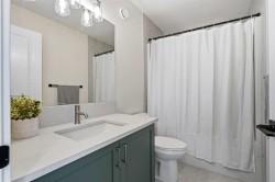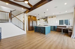 Welcome to 16 Key Cove in the Brand New Community of Key Ranch, Airdrie! Where luxury and functionality come together in perfect harmony. Built in 2024, this stunning home blends high-end design with everyday comfort and trust us, the photos don't do it justice! From the moment you step inside, you'll fall in love with the spacious front entry and rich flooring that flows seamlessly through the main level. The open-concept layout features an inviting living area, highlighted by gorgeous wood-beam ceiling details and a floor-to-ceiling fireplace that makes an incredible statement. The chef-inspired kitchen is a true showstopper, complete with rich cabinetry, upgraded countertops, premium appliances, a custom dining nook, and even a built-in wine rack. The walk-through pantry connects effortlessly to a generous mudroom for added convenience. Step outside to enjoy a fully landscaped backyard, featuring a large deck and new fencing, perfect for relaxing or entertaining guests. Upstairs, a central bonus room provides the ideal space for movie nights or homework sessions. You'll also find upstairs laundry, two spacious secondary bedrooms, and a luxurious primary suite that truly impresses. The spa-inspired 5-piece ensuite offers a walk-in tile shower, soaker tub, dual vanities, and a large walk-in closet. Your private retreat awaits! Additional features include central air conditioning, epoxy-coated garage flooring, and thoughtful upgrades throughout. This home truly has it all: style, comfort, and unbeatable value in one of Airdrie's most exciting new communities. See for yourself why 16 Key Cove should be your next address!