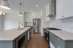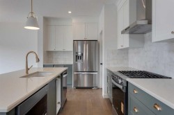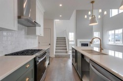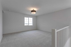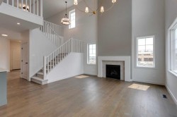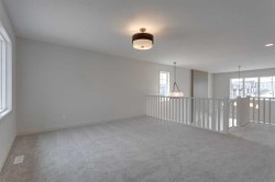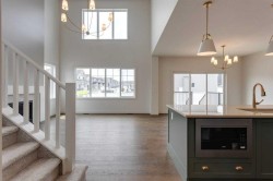 The Bayview Mews by Calbridge Homes offers 2,241 sq ft of living space with 3 bedrooms and 2.5 bathrooms. The main floor includes a kitchen with quartz countertops, large island, and stainless steel appliances, opening to a dining area and great room. A front lifestyle room provides additional living space. The upper level features a primary bedroom with walk-in closet and 5-piece ensuite, two additional bedrooms, a full bathroom, bonus room, and laundry. Located in Bayview, close to canals, parks, and over 100 km of pathways.