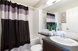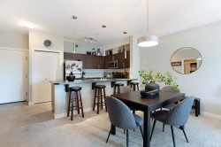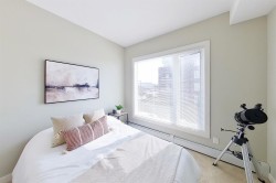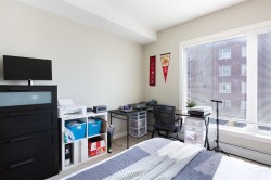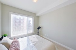 Discover unparalleled convenience and comfort in this beautifully updated, 847 sqft south-facing condo. With 2 bedrooms and 2 bathrooms, the functional floor plan expertly maximizes space and light, delivering a bright, inviting atmosphere through its open-concept design. Enjoy a spacious living room that flows seamlessly out to your exclusive, sunny balcony. The kitchen is a highlight, featuring warm walnut cabinets, a neutral backsplash, and a large island with seating for four, making it perfect for both casual meals and entertaining. Thoughtfully designed for privacy, the primary bedroom boasts a private 3-piece ensuite and is filled with natural light from a large window. This unit also includes a generously sized second bedroom, a full 4-piece main bathroom, and convenient in-suite laundry. The location is simply unbeatable: Situated on East Lake Boulevard, you are literally across the street from Genesis Place! Walk to Bert Church High School, the outdoor hockey rink, tennis courts, and nearby shopping. This bright, modern home in a well-maintained building is move-in ready and the ideal, hassle-free choice for first-time buyers, down sizers, or savvy investors. Book your showing today!