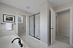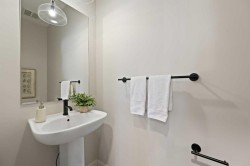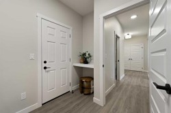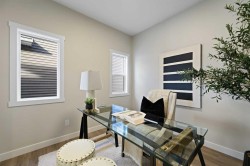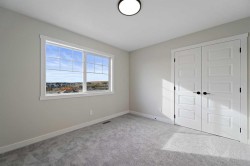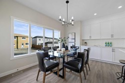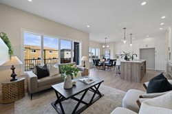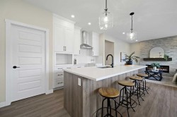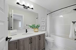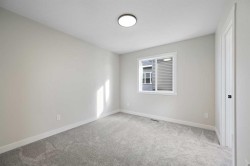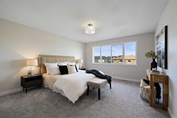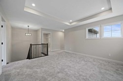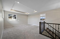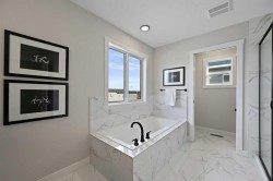 Genesis Builders presents the Ashdale, a thoughtfully designed 3 bedroom 2.5 bathroom home offering more than 2200 square feet along with a main floor office. Stepping inside, you are greeted by the warm ambiance of neutral tones and airy 9' ceilings. The luxury vinyl plank flooring guides you through the open concept main floor living space. The heart of the home is the chef’s kitchen with cabinetry finished in chantilly lace, accented by black and gold hardware, a wood grain island, a glossy white herringbone tile backsplash, and bright quartz countertops paired with a stainless steel appliance package. The open concept living area offers a generous dining room that flows into the living room and provides access to the north backyard where you will enjoy sunny evenings and beautiful sunsets. A stone faced feature fireplace anchors the living room and adds warmth and style. Complimenting the main floor is a private office, a powder room, and a convenient walk through pantry from the mudroom that connects to the double attached garage. Upstairs, a central bonus room with a tray ceiling greets you and separates the primary bedroom from the second and third bedrooms. The primary bedroom is a spacious retreat with an ensuite bathroom that includes double sinks, an oversized tiled shower, and a large walk in closet. The additional bedrooms are generous in size and function perfectly for kids or guests. A beautifully finished full bathroom and a laundry room complete this floor. The basement is a blank canvas with upgraded 9' ceilings and awaits your design ideas. Situated in the desirable bayview community, this family friendly neighborhood offers endless ways to get outside. You are steps from Nose Creek Elementary School, the pathways that wind along the scenic canals, a new playground, and so much more. *Area size was calculated by applying the RMS to the blueprints provided by the builder.