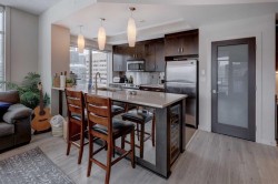 Welcome to this beautiful, modern 2 bedroom, 2 bathroom Premium Beltline condo featuring panoramic views to the north & west and titled parking stall and storage unit. Spanning 1,116 sqft, the sophisticated corner layout is framed by floor-to-ceiling windows capturing sweeping sunset, mountain and city skyline views. A huge, almost 300 sqft patio, is an entertainer’s dream, ideal for summer barbeques, morning coffee or evening cocktails under Calgary’s glowing skies. Inside we have a sleek open-floorplan with luxury vinyl plank and tile flooring throughout, quartz kitchen countertops, 9 ft ceilings, stainless steel appliances, a wine fridge and convenient office/study corner with built-in desk and cabinets. The kitchen overlooks the living area with spacious countertop and cabinet space, pantry and stainless steel appliances. The serene primary suite features a generous walk-in closet and spa-inspired ensuite with dual sinks, while the second bedroom offers ideal flexibility for guests, roommates or a home office with its own access to a full bathroom. In-suite laundry and central A/C are an added bonus. Castello is one of Calgary’s premier executive buildings, offering residents a fitness centre, guest suite, concierge services, car wash, bike rack area and pets are welcome (with restrictions). Perfectly located in the heart of the Beltline, you’re steps from 17th Ave and 4th Street restaurants, shops and vibrant nightlife.