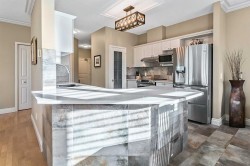 This stunning 1,304 sqft corner unit condo offers refined living in the desirable Lake Bonavista community. The bright two-bedroom residence features a spacious eat-in kitchen with granite countertops, stainless steel appliances, and a convenient corner pantry for optimal storage. The generous living room showcases beautiful laminate flooring, a cozy gas fireplace, and abundant natural light streaming through large windows adorned with elegant shutters. The primary bedroom provides a luxurious retreat with an expansive ensuite bathroom featuring a soaker tub, separate shower, and double vanity with ample counter space and storage. Additional accommodations include a second bedroom and full bathroom with shower, plus practical in-suite laundry facilities. Storage solutions abound with extra in-suite storage areas, air conditioning and a dedicated storage locker conveniently located across from your titled underground parking stall. Building amenities enhance your lifestyle with a movie theatre, fitness center, central kitchen, and an impressive party and social room perfect for entertaining guests. The location provides excellent convenience with close proximity to major amenities, shopping, and transportation corridors including Macleod Trail and Anderson Road. Transit accessibility is outstanding with Canyon Meadows light rail stations within walking distance. Recreation opportunities abound with Fish Creek Provincial Park just minutes away, offering extensive trails and natural beauty. This exceptional corner unit combines comfort, convenience, and community amenities for an ideal living experience!