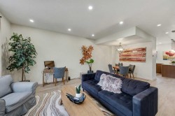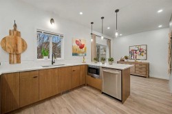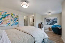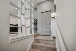 Welcome to The Fairways Vistas, your new home! This recently renovated executive-style townhome offers spacious living paired with stylish comfort and smart design. As you walk in, a mid-century partition opens up to a bright main living area featuring a large bay window that fills the room with natural light and courtyard views. The corner gas fireplace adds warmth and atmosphere, especially during those fall evenings. Next to the living room, a dropped ceiling defines the open dining area, which can also serve as a perfect spot for a home office. Past the main floor powder room is a modern kitchen outfitted with stainless steel appliances, quartz countertops, and elegant oak cabinetry. The practical layout includes generous counter space, a pantry near the range, and an oversized sink with a garburator, making meal prep easy. Hosting is simple with a sizable peninsula that features a built-in microwave, eating bar, and wine fridge. The adjacent breakfast nook is designed for gatherings and gives access to a large rear deck, complete with a gas hookup for barbequing and mature trees for privacy and shade. Upstairs are two large master suites. The primary suite has a walk-through closet leading to a roomy bathroom with a soaker tub, separate shower, and a wide vanity perfect for two sinks if desired. An adjoining flexible space works well as a reading nook, yoga area, or nursery. The second suite overlooks the SE facing courtyard and comes with a walk-through closet with custom wood shelving and upgraded organizers, plus its own full bathroom! The lower level provides a versatile ground-level area accessible from the double garage—ideal for a gym, hobby room, home office or extra storage. It's prepped for a future bathroom if you want to convert it into a lower-level laundry, wine making or mudroom. This home offers more space than most brand new builds and features larger and more private grounds. Premium upgrades including luxury vinyl plank flooring throughout, fresh paint, and updated lighting. Recent updates feature a fiberglass front door, insulated garage door with tinted windows, resurfaced deck and entryway, composite steps with aluminum railing, and improved roofing and gutters. Residents enjoy modern amenities in a mature community, close to golf courses, walking paths, the airport, major traffic routes, and all kinds of shopping. Schedule a visit to discover the comfort and lifestyle this outstanding residence has to offer.