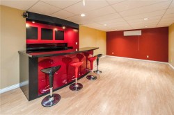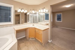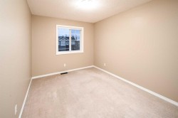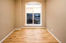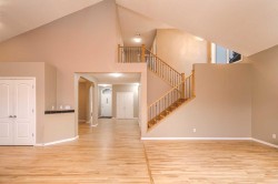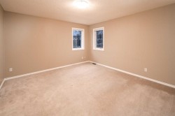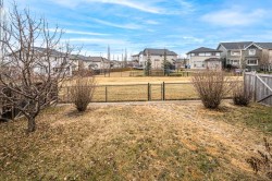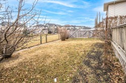 Backing onto a serene green belt, this cozy and well-kept 2-storey home is located in the highly sought-after community of Hanson Ranch. Offering a total of over 2,200 sq. ft. of living space, the main level features an open-concept design starting with a bright den/office, a spacious formal dining area, and a vaulted gourmet kitchen complete with granite countertops and maple cabinetry. The impressive 17-ft open-to-below living room is highlighted by a beautiful fireplace, while maple hardwood floors flow throughout the main floor.The upper level includes a generous primary bedroom with a 4-piece ensuite, along with two additional well-sized bedrooms. The fully finished basement adds even more value with a large family room featuring an elegant bar, a fourth bedroom, and a third full bathroom.Additional recent upgrades include new window coverings, new stove and fridge, and newly polished hardwood flooring throughout. The home also offers a double attached garage.Ideally located with easy access to Vivo Centre, Superstore, shopping, schools, and public transit.Call today for your private viewing — shows 10/10!