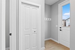 IMMEDIATE POSSESSION | 1,569 SQ.FT. | 3-BED | 2.5-BATH | SEPARATE SIDE ENTRANCE | 9' BASEMENT | UPGRADED KITCHEN | FRONT LANDSCAPING | This stylish NEW HOME by Crystal Creek Homes offers an OPEN MAIN FLOOR with 9-foot ceilings and a stunning rear kitchen designed for everyday function and entertaining. Full-height cabinets, quartz countertops, a GAS RANGE, and a large island provide plenty of space for cooking and storage. The great room, complete with an electric FIREPLACE, feels bright and welcoming. Upstairs are three bedrooms, a main bath, and an extra LARGE LAUNDRY ROOM. The primary bedroom includes a modern ensuite with thoughtful finishes. The 9' BASEMENT and separate SIDE ENTRANCE allow for future legal suite potential (subject to City approval and permitting). Set on a quiet street near a future school and soccer field, this home features durable HARDIE BOARD SIDING and quick access to Stoney Trail, East Hills shopping, and downtown Calgary. Book your showing today!