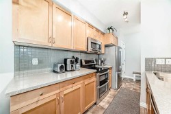 Welcome Home! Beautiful 1 bedroom, 1 bath, West facing condo in the desirable neighbourhood of Spruce Cliff! This second floor unit overlooking a green space boasts privacy and filtered shade created from the towering trees that are found in abundance on the immaculately kept grounds of Copperwood. Featuring a bright open floorplan with tall ceilings, soft neutral colour palate, cozy gas fireplace and in-suite laundry. The open galley style kitchen with newer stainless steel appliances, showcases maple cabinets, stylish grey tile backsplash, newer lighting and a curved breakfast bar. Find oversized windows that allow for plenty of natural light, dual closets in the large bedroom, plus a convenient cheater door to the 4pc bathroom. Copperwood is a well maintained quiet community, offering a fitness room, party room, visitor parking, car wash bay, assigned storage locker, bike storage . Fantastic location close to downtown with every amenity nearby! Walking distance to shopping, restaurants and the LRT, steps to Bow river pathways and Shaganappi Golf Course. This property is move-in ready and a must-see.