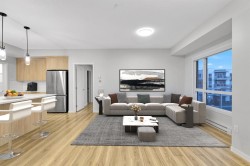 Discover life at Seton Summit, one of Calgary’s most desirable master-planned communities by Cedarglen Living. This beautifully appointed third-floor residence offers three bedrooms and two full bathrooms within 1,189 square feet of intelligently planned living space (1,269 sq.ft. builder size). The open layout is enhanced by 9-foot knockdown ceilings, luxury vinyl plank flooring, and an abundance of natural light throughout.With sunny southern exposure, the home opens onto an impressive balcony stretching more than 20 feet—an ideal setting for morning coffee, evening relaxation, or hosting friends. The kitchen is a standout, featuring full-height cabinetry, quartz countertops, an undermount sink, stainless steel appliances, upgraded lighting, a walk-in pantry, and a generous island that connects effortlessly to the living and dining areas.The primary bedroom offers a private and peaceful retreat, complete with a walk-in closet and a well-appointed four-piece ensuite with dual sinks and a walk-in shower. Two additional bedrooms allow for versatility, whether accommodating family, guests, or a dedicated home office. A conveniently located laundry and storage room, along with a second full bathroom, round out the efficient floor plan.Additional highlights include clear glass balcony railings, triple-pane windows, and air conditioning for year-round comfort. Residents also benefit from low condo fees, ample visitor parking, separate storage, and dedicated bike storage. The building is pet-friendly, allowing up to two pets weighing up to 35 kg. Underground titled parking and included roller blinds add to the everyday convenience.Located just steps from the world’s largest YMCA, the Seton HOA, shopping, dining, cafés, and the South Health Campus Hospital, this home offers an exceptional combination of lifestyle, comfort, and practicality in one of Calgary’s most vibrant communities.