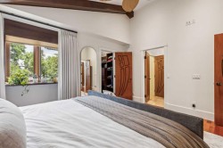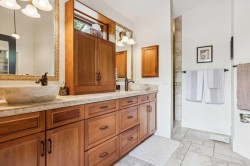 Step into the magical charm of this stunning home, where superior finishes and meticulous craftsmanship create a space that’s as functional as it is breathtaking. Nestled in an outstanding location, this property perfectly balances elegance, modern comfort, and thoughtful design, offering a true sense of flow and livability throughout. Every corner of this home reflects attention to detail and unique touches that will captivate you.The main floor is bathed in natural light from abundant windows, highlighting the rich Jatoba hardwood floors and solid core doors. Enjoy cozy in-floor heating and the comfort of air conditioning year-round. The living room serves as the heart of the home, featuring a custom-built surround fireplace and patio doors that seamlessly connect indoor and outdoor living. Entertain effortlessly in the gourmet kitchen, complete with integrated cherry cabinetry, granite countertops, a built-in table, and top-of-the-line appliances. Adjacent is the formal dining room with an open-beam ceiling that exudes elegance, plus a versatile den with a built-in desk—perfect for a home office or study.The open, solid staircase leads you to three spacious bedrooms, each thoughtfully designed with vaulted ceilings and walk-in closets. A Jack & Jill 4-piece bath connects the secondary bedrooms, while the executive master suite offers a private retreat. Step out onto your own secluded deck, complete with a hot tub and plasma screen, and indulge in the spa-like 5-piece ensuite bath with and large walk-in shower. A perfect sanctuary for relaxation.The lower level continues the theme of quality and comfort, featuring a full media room, one additional bedroom, and plenty of space for family or guests. Integrated Russound audio, full electronic wiring, Pella casement windows, and surround sound throughout the home ensures a modern lifestyle with convenience and sophistication at every turn.From top to bottom, this home is a testament to exceptional design, quality construction, and timeless elegance. A rare opportunity to experience luxury living in an ideal location.