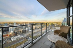 This beautiful, airy sub-penthouse in The Guardian North Tower welcomes you into a world of light and breathtaking views. Located on the 36th floor, this two-bedroom contemporary condo offers 1,260 sqft of refined urban living. The northeast corner location (one of only 4 units) on the 36th floor provides 270-degree views from the downtown skyline to the West, sweeping across to the North and wrapping all the way around to the East. Featuring floor to ceiling windows, 10-foot ceilings and terraces off the principal living spaces, the master bedroom, and the second bedroom. The main living area seamlessly flows with an open floorplan concept, and the bedrooms are ideally located for privacy and seclusion. Exceptional finishings such as engineered hardwood flooring, ceramic tiling, and blackout blinds offer comfort and luxury. Upgrades include an expansive pantry off the kitchen, and double blinds throughout offering either custom black-out or filtered light options. The living room affords downtown skyline views, and long-range views to the north and the east. Step onto the terrace through the patio doors and bring the stunning views into a spectacular perspective. Nestled between the living room and the kitchen, the dining room is elegant and offers spacious accommodation for a table of 8-10. The kitchen is a chef’s dream with Italian Armony Cucine cabinetry, a full Miele appliance package, and a large full waterfall island with seating for 4-5. Quartz counter-tops and a glass backsplash complete a stylish and beautiful kitchen that creates seamless entertaining and comfortable family living. Providing comfort with sophisticated style, the main living area and terrace are ideally suited for entertaining and modern living, all while enjoying unrivaled views, sunsets, and extraordinary downtown city lights. The primary bedroom is a tranquil retreat and offers outstanding city views, a 5-piece ensuite with double vanity, quartz countertops, and an upgraded, customized large walk-in closet. The second bedroom is optimally located on the opposite side of the floor plan and has its own 4-piece ensuite with quartz counter-tops. This bedroom also has two closet spaces with built-ins and its own private terrace with stunning east and north views, ensuring privacy and comfort for guests or family members. In-suite stacked laundry and an expansive pantry, and elegant powder room round out the living space. This unit comes with two side-by-side titled parking stalls in the underground heated parkade, in a coveted location directly opposite to elevator access. It also has an assigned storage locker, and all the amenities of The Guardian. Full-service amenities include a concierge, security, a state-of-the-art fitness facility, Residents Club, and outdoor garden terrace. Experience the convenience and excitement of living just steps away from shopping, restaurants, the new BMO Event Centre, and Pixel Park offering a dog park and sports courts, and the new Scotia Place