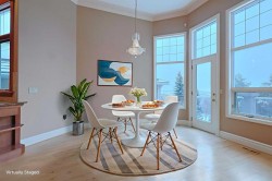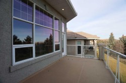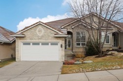 Rare opportunity here in Calbridge’s exclusive villa complex of CHATEAUX ONE, in this highly-coveted location backing onto the prestigious Hamptons golf course. Offering over 2600sqft of refined luxury living, this exquisite 2 bedroom + den villa enjoys relaxing central air & granite countertops, beautiful maple floors & 2 fireplaces, fully-loaded chef’s kitchen & panoramic views of the golf course. Complemented by soaring 12ft ceilings & bathed in natural light, the air-conditioned main floor of this fully finished bungalow features an expanse of floor-to-ceiling windows, elegant formal dining room accented by stately columns, wonderful living room with gas fireplace & open concept dining nook with access onto the backyard balcony. The gourmet maple kitchen is simply stunning & has rich custom cabinets & granite counters, large walk-in pantry & the upgraded stainless steel appliances include Bosch dishwasher & GE stove/convection oven. The relaxing owners’ retreat has a big walk-in closet & sleek ensuite with skylight & tile floors, jetted tub & glassblock shower. The walkout level is beautifully finished with a 2nd bedroom with walk-in closet, full bathroom, an unbelievable amount of extra space for storage (or future home gym or workshop) & sensational games/rec room with fireplace, extensive built-ins & Murphy bed. Main floor also has a dedicated home office with glass French door & laundry room complete with sink, built-in cabinets & LG washer/dryer. New epoxy floors in garage & carpets in 2025, hot water tank replaced in 2019. The lucky residents of CHATEAUX ONE also don’t need their lawn mower or shovel because grass cutting & snow removal are covered by the monthly maintenance fees & irrigation for the underground sprinkler system is also included. A truly outstanding home in this sought-after golf course community, within walking distance to the golf course clubhouse & bus stops, only minutes to neighbourhood amenities & shopping, & easy access to major retail centers, Crowfoot Centre & LRT, top-rated schools & hospitals, University of Calgary & downtown.