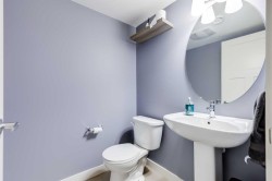 ***MODERN AIR-CONDITIONED CORNER UNIT!*** Step into this bright and open concept, former show home with 2 primary bedrooms, PLUS Office/Den/Guest bedroom on the main floor, 2.5 bathrooms. The living room has a full feature REAL stone wall with a built-in custom cabinet and shelving unit. An elegant electric fireplace. The Kitchen has silver pearl granite countertops, a large island with an eating bar, a formal dining room. Perfect for relaxing and entertaining is the patio door off the dining room, with a natural gas line, which makes it the perfect outdoor space for BBQ, you’ll never have to run out for propane in the middle of cooking dinner ever again! The spacious upper level comes with a vaulted ceiling throughout the whole upper floor, it offers a generous bedroom, 4pc bathroom, a large primary bedroom with room for a king-size bed, a walk-in closet, and a 3pc ensuite bathroom comes with a heated tile floor to keep your toes warm after your shower, and upgraded vanity with quartz countertop. The laundry/storage room is also conveniently located on this level next to all the bedrooms. The whole house has upgraded décora light switches with added multiple dimmers switches, timers, smart switches and led lighting. The single attached garage has additional custom-built storage shelving units. This CORNER UNIT is perfectly located next to the street of Skyview Ranch Manor, which offers ample public street parking in addition to visitor parking space just next to the unit. With nearby school and shopping, this home has it all. Don’t wait, make this one yours today!