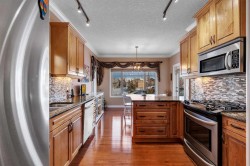 RARE OPPORTUNITY to own this immaculate 55+ walkout bungalow-style villa backing directly onto greenspace—with no neighbours behind! Tucked into one of the best locations in the community, this home is ideal for empty nesters and downsizers seeking a low-maintenance lifestyle without sacrificing space or comfort. From the moment you step inside, you’ll notice the executive upgrades including 9’ ceilings, custom crown moulding, and hardwood flooring throughout the main level. The layout is bright and functional with a spacious tiled front entry, a front den/office with large windows, and a formal dining area perfect for hosting. The kitchen offers granite countertops, corner pantry, an updated tile backsplash, and newer stainless-steel appliances including a fridge with water and ice, dishwasher, and microwave hood fan. The adjacent eating nook showcases unobstructed greenspace views and leads to the deck—a perfect spot for morning coffee or quiet evenings outdoors. The living room is warm and inviting and includes a three-way fireplace. The primary suite is a great size and features a walk-in closet and a beautifully updated ensuite with heated floors, a tiled shower and Jacuzzi tub. The main level is complete with a powder room and convenient laundry with new washer and dryer (2024). Downstairs, the walkout lower level expands your living space with a large family room featuring a gas fireplace, built-ins, a spacious additional bedroom, and a full bathroom. There’s also a versatile room that is ideal for an office, hobby space, rec room, or potentially an additional bedroom plus plenty of storage. Additional highlights include air conditioning, and a central vacuum system. Best of all: no condo fees—just a low $180 HOA fee covering lawn care, snow removal, and irrigation, making this an ideal turn-key option for those looking to simplify and enjoy life. With easy access to Stoney Trail, shopping and amenities this move in ready villa is not to be missed!