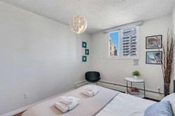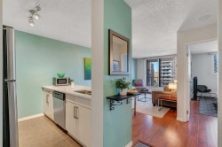 MODERN 1-BED / 1-BATH DOWNTOWN CONDO W/ PARKING & CITY VIEWS IN REVITALIZED EAU CLAIRE! Welcome to Prince’s Crossing, a well-managed concrete building in the heart of Eau Claire — one of Calgary’s most walkable, connected & beloved downtown communities! This upgraded 1-bed, 1-bath condo with underground parking offers incredible value for first-time buyers and investors alike, just steps from the Bow River pathways, Peace Bridge, and the brand-new Eau Claire Plaza. Stepping inside, you’re greeted by a bright, open-concept layout with beautifully kept walnut laminate floors and large windows. The kitchen has been tastefully upgraded with Quartz counters, stainless steel appliances, and tile backsplash. Beyond the dining area, the living room feels spacious and inviting, with floor-to-ceiling windows that frame downtown views. The sliding glass doors lead you to a private covered balcony — your own outdoor retreat in the city, overlooking Eau Claire and the surrounding skyline with plenty of room to sit, relax & enjoy a morning coffee! Back inside, the bedroom is generously-sized and includes a custom closet system to maximize storage. The 4-piece bath has also been upgraded with a Quartz vanity, modern shelving, and a full-height tiled tub/shower. A large in-unit walk-in storage room is the perfect place to store large seasonal items like sports equipment or holiday decorations. To complete the unit is an assigned parking stall in the secured underground parkade and laundry is available in the building. Prince’s Crossing offers residents excellent amenities including a fitness centre + sauna, bicycle storage and secured parking. While the unit does not have in-suite laundry, the condo board provides clear and easy instructions for adding a washer/dryer — posted for owner convenience. You also get direct access to daycare services, a beauty salon & restaurants in the building plus Alforno's Bakery right across the street! On top of that, living in Eau Claire definitely has its' perks - Right outside your door, the community has been completely reimagined as part of the City of Calgary's Eau Claire Revitalization Project with the brand-new Eau Claire Plaza, a pedestrian-friendly riverfront promenade, and the beautiful new Jaipur Bridge connecting you right to Prince’s Island Park. Couple of blocks away is the LRT free fare zone which gives you the ability to hop on a train and get access to all of the unbeatable amenities Calgary's downtown core has to offer with ease. Jumping in the car: Airport is a 22 min drive (18.8KM), & Banff is a 1 hr 25 min drive (126KM).