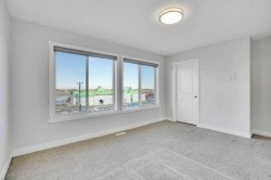 Welcome to this stunning 1,649 sq ft, 3-storey townhome offering 4 bedrooms, 2.5 bathrooms and a bright modern design in an unbeatable location. The main level features a welcoming foyer, a main-floor Den and convenient interior access to the double attached garage. Upstairs, the open-concept living space is filled with natural light and enhanced by high ceilings, showcasing a central kitchen with full-height cabinetry, quartz countertops, stainless steel appliances, a large island and an extended breakfast bar. The dining area opens onto a private balcony with a gas line for BBQs, while the spacious living room offers a TV-ready wall and plenty of room to relax or entertain, all complemented by a 2-piece bath. The upper level includes three sizeable bedrooms, two full bathrooms and upper-level laundry, with the primary suite featuring a walk-in closet and a private 5-piece ensuite with double quartz vanity. A beautifully maintained shared outdoor space enhances the complex, and the location is ideal with quick access to Stoney Trail SE, making commuting to Calgary fast and convenient. The property requires TLC and is being sold as-is
