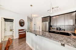Welcome to 3104, 15 Sunset Square — a beautifully designed 2-bedroom, 2-bathroom ground-floor condo in Cochrane’s sought-after Sunset Ridge community. With 1,021 sq. ft. of stylish, comfortable living space, this home blends modern convenience with a warm, welcoming feel you’ll notice the moment you step inside.The open-concept floor plan is bright and spacious, highlighted by 9-foot knockdown ceilings and infloor heating with dual zones for year-round comfort. The kitchen is a showpiece — featuring stainless steel appliances, granite breakfast bar, and elegant pendant lighting that creates the perfect space for cooking, entertaining, or sipping your morning coffee.The huge primary bedroom feels like a private retreat, complete with a large walk-in closet and a roomy 3-piece ensuite. A second spacious bedroom sits near the 4-piece main bathroom, which includes a convenient cheater door for added privacy — ideal for guests or shared living.From the open and inviting living room, step outside to your large ground-floor patio, perfect for relaxing with friends or enjoying a quiet evening by the BBQ (gas line ready!). You’ll love the insuite laundry, and the rare convenience of two titled parking stalls — one secure space in the heated underground parkade (with storage locker) and one handy surface stall just steps from your door.Located in the heart of Sunset Ridge - this community is known for its friendly neighbours, peaceful atmosphere, and incredible amenities — enjoy nearby walking paths, parks, coffee shops, restaurants, and a neighbourhood grocery store. With Cochrane’s beautiful mountain views and the Bow River pathways just minutes away, every day feels like a breath of fresh air.Whether you’re looking to downsize, invest, or simply enjoy a low-maintenance lifestyle in a warm and welcoming setting, this stunning condo is the one you’ve been waiting for.Schedule your showing today and discover the comfort, style, and charm of life at 3104, 15 Sunset Square.