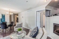This cozy, 2 bed/2 bath, 854 sq ft unit is well lit with natural light due to its private corner location. It features A/C, a fireplace, stainless steel appliances, as well as a large wrap-around patio that is great for outdoor living and enjoying the city views. Your new home awaits in a vibrant neighborhood surrounded by the Ice District/Rogers Place Arena, MacEwan University, the LRT, and popular dining spots like the Lingnan, & Brew and Bloom. Additionally, the property offers heated underground parking; a valuable feature during the winter months in Edmonton. This property is popular due to its location and proximity to amenities. Come take a look!