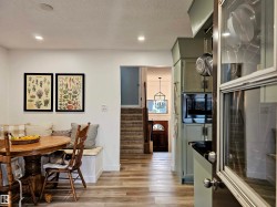 Gorgeously updated and quietly enchanting, this 4 bed/3 bath home rests on a park-like 7,324+ sq ft west-facing lot at the heart of a serene Greenview cul-de-sac. Across 2,650+ sq ft of beautifully refreshed living space, warm longboard flooring (2022) and soft neutral tones create an inviting sense of calm. Sunlight pours through the front living room into the formal dining area and kitchen (2022), where upgraded appliances and quartz counters frame a sun-swept breakfast nook. From here, step into the glowy sunroom just off a newer patio (2024), w/ the kind of private yard that makes evenings linger. Down the hall, a 4 pc bath and generous 2nd and 3rd bedrooms await. Upstairs, the oversized primary retreat feels almost storybook with its California Closet walk-in, private study, and luxurious 5 pc ensuite. A finished basement adds a timeless brick wood-burning fireplace, great room, 4th bedroom, gym, & 3 pc bath. Extras incl. tankless hot water (2024), NEW furnace & heat pump (2025), and EV-ready garage.