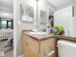Top-floor living in South Terwillegar! This bright 2-bedroom, 2-bath condo combines comfort and convenience with a layout designed for modern life. The spacious primary suite offers a walk-through closet and full ensuite, while the second bedroom and additional full bathroom provide flexibility for family, guests, or a home office. A large in-suite storage room with laundry adds everyday practicality. Vaulted ceilings and nearly floor-to-ceiling windows flood the open kitchen and living area with natural light, creating a warm and inviting space to relax or entertain. Step out onto your private balcony for fresh air and a view over the community. This unit also comes with TWO titled parking stalls located near the entry. Perfectly located close to Anthony Henday, schools, parks, and everyday shopping. Whether you’re a first-time buyer, downsizer, or investor, this move-in-ready condo is a smart choice in a wonderful community.