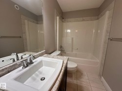Available from December 1st! This modern 2-storey home, built in 2016, is located in the desirable community of Desrochers. Offering 1,275 sq. ft. of bright, open living space, this property is perfect for families or professionals seeking comfort and convenience. The main floor features a spacious living room, large dining area, and a stylish kitchen with granite countertops, stainless steel appliances, and a breakfast bar. Vinyl plank flooring and main-floor laundry add practicality and ease of care. Upstairs, you’ll find a primary bedroom with a walk-in closet and 4-piece ensuite, plus two additional bedrooms and a full bath. The landscaped backyard is fully fenced and includes a double detached garage with rear lane access. Excellent location close to Anthony Henday, QEII, parks, schools, and shopping. Utilities are separate. No pets or smoking permitted.