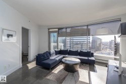 Dreaming of life in the heart of downtown? Perched on the 21st floor of the prestigious Icon II building on 104th Street, this stunning 2-bedroom, 2-bath condo offers 846 sq ft of upscale living space.Designed with modern elegance in mind, the home features polished concrete floors, upgraded custom lighting, granite countertops, and air conditioning for year-round comfort. Step out onto the expansive west-facing balcony and take in sweeping views from Rogers Place to the River Valley, while enjoying the vibrant atmosphere of 104th Street below—including the popular Saturday Market. Everything downtown Edmonton has to offer is just steps away: restaurants, shopping, Grant MacEwan University, and more. The unit also includes one titled parking stall and a rare storage locker—one of the few available in the building.