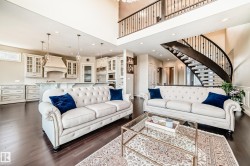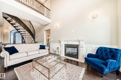 Experience refined luxury in this one-of-a-kind estate on a private walkout ravine lot in Jaguar Ridge, custom-built by Carriage Homes. This elegant residence offers 3 living areas, 3 dining areas, 4 bedrooms, 5 bathrooms, and an oversized heated triple garage. A grand entrance with 19-ft ceilings, a curved staircase, natural light, and hardwood flooring leads to a greeting room, formal dining, and an open-to-above great room. The chef’s kitchen connects to a full dining area with access to the covered deck and a dual-sided fireplace overlooking nature. The main floor includes a bedroom with a 3-pc ensuite. Upstairs features a bonus room, a spacious primary suite with private balcony, 5-pc spa ensuite, and dressing room, plus two additional bedrooms with ensuites. The walkout basement, with three entrances, 9-ft ceilings, rough-ins, and a planned two-sided fireplace, is ready for development. Stunning chandeliers and detailed wainscoting elevate this home’s timeless elegance. Made for classy living!