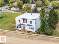 EGREMONT HOTEL RESTAURANT – ENDLESS POTENTIAL! Currently used as a residence, this well-maintained 2-storey property can easily be converted back into a bar, hotel, or restaurant. A community landmark, it’s ideally located near Redwater, Fort Saskatchewan, and the Industrial Heartland, with Edmonton just a short drive away. Pride of ownership is clear with upgrades including some windows, exterior paint, furnaces, air conditioning, newer hot water tank, plumbing, wiring, bathrooms, and basement improvements. The main floor previously featured food & beverage service with bar, dining areas, kitchen, & musician stage. Upstairs offers a kitchen, living room, 2-bedroom suite, plus 4 additional bedrooms—perfect for guests, owners, or management. The spacious lot includes a Quonset-style garage. Land and building included—ideal for food & beverage, retail, business, or office use.