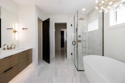 SHOW HOME FOR SALE! This award-winning show home in Southbrook, built by Stranville Living Master Builder, is finally ready to be sold and occupied by a lucky new homeowner. This Perth II model with walk-out basement has been recognized locally , provincially, and nationally for it's overall design, the executive kitchen, and the primary ensuite, making it one of the most popular builds every produced by Stranville Living. The pictures speak for themselves, but this home must be seen to be fully appreciated. The main floor is blessed with a gorgeous kitchen, accented by two-tone cabinetry, veined waterfall quartz island, and seamlessly integrated panel-ready appliances. Adjacent to the main kitchen is a private spice kitchen that includes a gas range and electric oven, hood fan, sink , and dishwasher. The striking main floor fireplace is a show-stopper that centers the family room and towers up the 18' ceilings in the open-to-below area with massive south-facing windows overlooking the pond at Discovery Park. Stairs with glass railing lead you to the upper level where you'll find the 170+ square foot primary bedroom that also enjoys views to the south. There are not many ensuite bathrooms that can rival this beauty, with features that include a custom shower with integrated tiled floor and walls, floating vanity in quarter-sawn oak with double sinks and floor lighting, deep soaker tub with floor-mounted fixtures, and a private water closet. Through the ensuite, you'll find the laundry room with a stacking washer/dryer set with sink and cabinet. Two more ample bedrooms, full bathroom, and generous media room wrap-up the upper level. The fully developed walkout basement adds two more bedrooms, full bathroom, and family room with a sliding patio door to the rear yard. If you're looking for 5-bedroom, fully developed, fully landscaped southside home with upgrades for days, you've come to the right house. There's nothing like NEW!