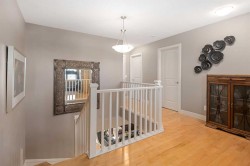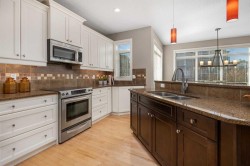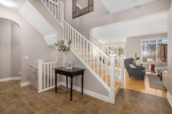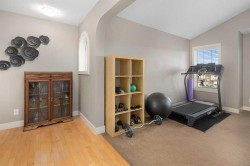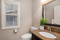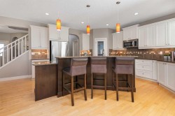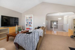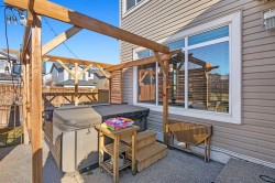 Welcome to your new home on a sunny corner lot in Westmount Court!As you step inside, you are greeted by a large entrance featuring ceramic tile floors that lead you to a versatile main floor office. This space has French doors and a transom windows for extra light, making it the perfect spot for work or study An expansive living room with large windows and gas fireplace creates a cozy space on a chilly evening. You will appreciate the white kitchen, equipped with upgraded cabinets, quartz countertops, stainless steel appliances and under-counter task lighting. There is plenty of counter space and cupboards as well as a pantry. The breakfast bar is a great place to relax over morning coffee. The adjoining dining area features more oversized windows with mountain views. The dining room overlooks the private backyard, where trees and shrubs offer added privacy. The West backyard is great for entertaining, complete with a pergola and concrete aggregate patio. Unwind after a long day in the hot tub. The functional, thoughtfully designed main floor also features a convenient laundry room and a powder room. The second floor bonus room is bathed in natural light and features vaulted ceilings. The primary bedroom is a true sanctuary, with another vaulted ceiling, a spacious layout with large walk in closet and an 5-piece ensuite bathroom. Indulge in the double vanities with quartz counters, a double shower with a bench, and a relaxing corner soaker tub. Two additional kid-friendly bedrooms and a well-appointed 4-piece bathroom complete this level, along with extra storage options provided the linen closet and a dedicated storage closet in the main bath. The unfinished basement presents a blank canvas, offering lots of storage space and the perfect opportunity to create the additional living area of your dreams! You’ll love the impressive upgrades throughout, including crown mouldings, 9-foot ceilings, and hardwood floors. There is a new, high efficiency furnace to keep you comfortable this winter and 5 large windows in the basement. This lovely family home has an ideal location, backing onto a walking path, and is just minutes away from schools, playgrounds, green spaces, and convenient shopping options. Experience the perfect blend of comfort, style, and functionality. Quick possession is possible.