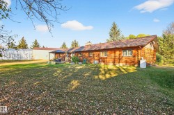 Stunning 2,034 sq.ft log bungalow on 2.06 private acres in Spanish Oaks, just off Hwy 60 and minutes from Edmonton! This beautifully upgraded home features vaulted ceilings, hand-carved bamboo flooring, a cozy wood-burning fireplace, modern kitchen with built-in appliances, 3 spacious bedrooms, 2 living rooms, and a formal dining area. Recent upgrades include a metal roof, triple-paned windows, furnace, hot water tank, pressure tank, flooring, and full log treatment. Outside, enjoy a 28' x 50' shop with radiant heat, 14' high door, 220 power, 200 amp service, floor drains & room to park your RV indoors! Additional features: $150K in recent upgrades, new HVAC, water treatment system, oversized heater, 8x10 & 16x16 sheds, a 16x24 powered clubhouse, and a large storage Quonset. The landscaped yard includes fruit trees, perennials, a large deck, firepit & garden area. Located at the end of a quiet cul-de-sac, this incredible property offers privacy, functionality & charm. A rare find!