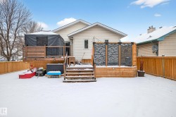 Welcome Home! FULLY FINISHED AND UPGRADED! Move in, enjoy your 3 bedroom, 3 bathrm home featuring modern kitchen w/quartz countertops, corner pantry and stainless appliances. Warm and inviting living room bathed in sunlight, massive primary suite with newly renovated ensuite bath, walk in closet. Second bedrm and renovated 4 pce bath complete main floor. Lower level is the perfect family "hangout". Supersized family/rec rm.open and filled with natural light. Spacious 3rd bedroom, renovated 3 pce bath, laundry. Private oasis backyard. Beautifully landscaped with decks, hot tub, shed, trees and perennial beds. South exposure makes it wonderful. Recent upgrades: furnace(4 yrs), shingles (10 yr.), fence, paint, carpet, permanent exterior soffit lighting, gazebo(2025), lighting (2025), ensuite(2025), dishwasher(2025),and so much more. All in a super location in desirable Heritage Lakes w/ easy access to Henday, 137 ave , schools, shopping, transportation etc