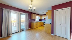 Located on the north side of Stettler, this welcoming home offers comfort, convenience, and excellent livability for families and empty nesters. The living room sits just off the front entrance and features generous front windows that bring in natural light and a well-placed coat closet for everyday practicality. A pony wall topped with pillars defines the dining room and gives the main floor a touch of elegance. Garden doors lead from the dining space to the outdoors, creating an easy flow for family gatherings, barbeques, and relaxed evenings on the back deck. The kitchen features wood cabinets and ample counter space, making meal preparation enjoyable and efficient. A hall closet houses the washer and dryer, offering convenient main-floor laundry that appeals to busy families and those seeking a low-maintenance lifestyle. The primary bedroom is spacious and includes an ensuite with a walk-in shower for added comfort. A second bedroom works well for children, visiting family, hobbies, or home office needs. The main bathroom includes a tub and shower combo suitable for all ages. The basement is a blank canvas with exceptional potential. Families can envision a future family room, additional bedrooms, or play spaces, while empty nesters may see opportunities for hobby areas, a workshop, or extra storage. In-floor heat is installed, and plumbing for a future bathroom is already in place. Mature coniferous trees in the front yard provide privacy and shade. A front deck offers a peaceful spot to enjoy morning coffee. The backyard features an open, partially fenced yard with mature trees along the east side, creating a comfortable outdoor space. This home is located within walking distance to the mall, coffee shops, and a playground. This is a versatile home ready for a growing family or anyone seeking a comfortable downsizing option.