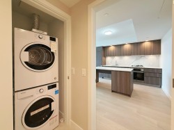 Welcome to contemporary urban living at the heart of Burnaby's Metrotown. This stylish 1-bedroom home in a 1-year-old concrete tower features air conditioning, premium Miele appliances, sleek cabinetry, and functional open-concept design. Enjoy beautiful city and mountain views from your private space. Comes with 1 parking and 1 storage locker. Outstanding amenities include concierge, fitness and yoga rooms, theatre, games lounge, outdoor BBQ area, and dog wash station. Steps to Metrotown SkyTrain, Metropolis Mall, Crystal Mall, Central Park, and vibrant local cafes and shops.