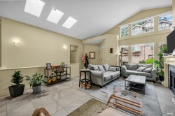 Prestigious gated community “Seasons by the Lake” beside Deer Lake trails! This fully renovated 2-level townhome offers 2,695 sq.ft. of luxury living w/ radiant in-floor heating & soaring 18-ft vaulted ceilings. Elegant living & dining, gourmet kitchen w/ SS appliances, breakfast nook & large balcony w/ lush views. Features 3 spacious bedrooms + versatile den (4th bdrm option), spa-inspired primary ensuite & an enormous rec/entertainment room ideal for theatre, gym or family use. Perfect location - mins to Metrotown, Skytrain & Hwy 1. Rare opportunity in sought-after Oakmount community!