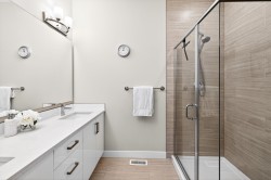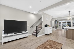 Welcome to this well cared for, 8 year old corner unit in Midtown with all the upgrades done. Stone countertops throughout, HW on demand, AC, privacy blinds, 12' vaulted ceiling in the master bedroom, double vanity in the Master bath, massive kitchen island, lots of cupboards, open concept living on main floor with 9' ceilings, large rec room & bathroom below, central vac and brand new high end Bosch dishwasher. Best location in the complex! Flex room below could be a 4th bedroom! Outside there is a fenced yard and a large beautiful 8x18 deck off the main with built-in pergola and privacy screens. This unit has the largest driveway in the complex big enough for large trucks and vans, as well as a large side by side garage. Tons of storage space in double wide garage.