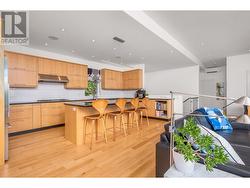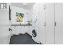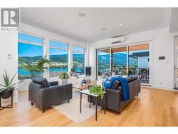 Drawing inspiration from Frank Lloyd Wright, this architecturally stunning home blends modern elegance with intelligent design. The exterior features custom metal privacy screens, cedar soffits with pot lighting, concrete planters, and exposed aggregate pathways with integrated stair lighting. A large, covered deck with glass railings captures breathtaking views of the Kalamalka Lake, Coldstream Valley, and Monashee Mountains. Inside, 2x8 double-staggered stud construction, 9 zone radiant in-floor heating and home automation for lighting, vertical blinds, water sensors, sound systems, TV, Security cameras, climate and home monitoring for comfort and efficiency. A private elevator connects all floors, including garage-to-kitchen access. Beech plank and tile flooring flow throughout, with rubberized tile in the gym. The top-floor kitchen features Miele appliances including a combi oven and steam oven, black quartz countertops, and a spacious island with a chef’s sink. The open living/dining area is surrounded by windows and features 3 panel sliding door making an 8’ opening to a 24x24’ partially covered deck with BBQ hookup and ceiling heater. The primary suite includes patio access, steam shower, dual vanity, and built-in cabinetry. 2 additional bedrooms, a full bathroom, den, large office, and gym round out the space. Thoughtfully integrated storage, an epoxy-finished garage, ductless AC, HRV and humidifier systems, and a hot water boiler complete this exceptional smart home. (id:27)