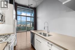 Rare opportunity in the highly sought-after Cannery Lofts, located in the heart of downtown Kelowna. This top-floor, lake-facing unit offers an exceptional blend of style, comfort, and convenience. Featuring 20-foot ceilings and a contemporary loft design, the home includes one bedroom, two bathrooms, and a spacious flex room that can serve as a second bedroom, office, or den. The open-concept living area is bright and airy, with floor-to-ceiling windows, a gas fireplace, and access to a covered patio with lake views. The kitchen is equipped with upgraded appliances, including a gas range. Additional highlights include in-suite laundry, hardwood flooring, newer carpet and window coverings, and fresh paint throughout. The secure concrete building offers one indoor parking stall, bicycle storage, a shared rooftop patio, and excellent security features. Pet permitted with approval. An exceptional downtown lifestyle steps from restaurants, cultural amenities, and the business district. (id:27)