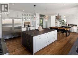 Completely renovated from top to bottom, this breathtaking residence embodies refined living in Wilden—Kelowna’s most coveted enclave. The striking modern exterior with crisp white & black accents makes a bold statement, setting the stage for the exceptional design inside. Expansive windows frame captivating lake & mountain views, while soaring ceilings & a stunning floor-to-ceiling fireplace create a grand yet inviting atmosphere. The designer kitchen is a showpiece, featuring a massive Dekton island, 6-burner Thermador range, butler’s pantry, beverage centre & seamless flow to the covered deck—ideal for entertaining. Upstairs, the primary suite is a private sanctuary with sweeping views & an ensuite that rivals a luxury spa, complete with heated floors & a double rain shower. Two additional bedrooms & a full bath complete the upper floor. The lower level offers ultimate versatility with engineered hardwood: an elegant family lounge, custom wine cellar, gym space, guest bedroom & a bathroom with direct access to the outdoor retreat. Step outside to the saltwater pool with auto cover, hot tub & multiple lounging areas—surrounded by protected green space for unparalleled privacy. Notable features include real hardwood throughout the rest of the home, a 3-zone furnace, 240V EV-ready 3-car garage, electric window coverings, UV-filtering windows & solid 8ft doors. A true legacy home—where sophisticated design meets everyday comfort in an irreplaceable setting. (id:27)