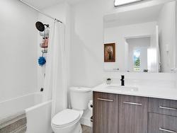 Private, top-floor 2 bed, 2 bath condo at Reunion in Langford’s Belmont community. Nearly 1,000 square feet of well-designed space with elevated ceilings and oversized windows for great natural light. Bedrooms are separated for privacy, plus there's a work-from-home nook. The kitchen features full-height cabinetry, quartz countertops, Whirlpool appliances, and a large island. The primary suite includes a walk-through closet and ensuite with double sinks and glass shower. Private covered balcony has treetop views and a gas BBQ hookup. Full-size in-suite laundry, large pantry storage, secure underground parking, and storage locker included. Pet- and rental-friendly building. Amenities include fireside lounge, chef’s kitchen, gym, outdoor BBQ area, dog wash, dog run/play area, and bike storage. Across from Belmont Market and Westshore Town Centre. Direct access to Galloping Goose Trail and close to parks, lakes, and Bear Mountain.