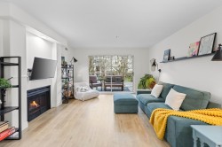 Step inside and fall in love. This bright 2 bed, 2 bath corner suite has been thoughtfully upgraded. The kitchen shines with expansive quartz counters, a custom coffee bar with floating shelves and bar fridge, sleek white shaker cabinets with soft close doors and under mount lighting, plus stainless appliances including a 4 door fridge. Oak laminate flooring and custom lighting carries through the home for a warm, elevated feel. The open living and dining space is perfect for relaxing by the gas fireplace or stepping onto your sunny south facing balcony. Enjoy views of mature trees from every room. Both bathrooms feature quartz counters and deep soaker tubs. Full size laundry adds convenience. Bonus extra street parking for your second car and a short distance to the future SkyTrain.