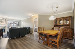 Welcome to Monterey Grande! This rarely available TOP FLOOR 2-bed, 2-bath condo offers 1,030 sq ft of spacious living in a QUIET location. You will be greeted with an open floor plan featuring UPDATED laminate flooring & crown moldings with a large dining area open to the living room featuring a cozy gas fireplace! The oversized primary bedroom boasts double closets w/ensuite + generous second bedroom, family bathroom & laundry room with SXS washer & dryer! Enjoy your morning coffee with mountain views on your large covered deck! BONUS storage locker conveniently located right beside your unit + 1 underground secure parking spot! The well-managed building features an amenity room, bike storage & workshop. Located - close to shopping, restaurants, an off-leash dog park & future Skytrain!