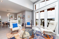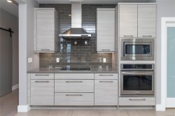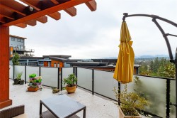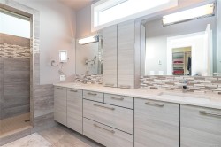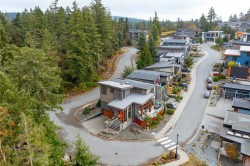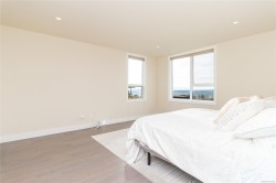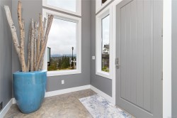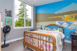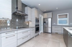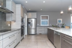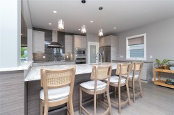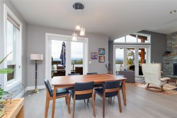 This professionally finished, custom-designed home showcases modern architecture with vaulted ceilings, expansive windows, and warm wood flooring. The exterior features easy-maintenance materials enhancing its clean appeal. The living room offers a cozy gas fireplace and French doors opening to a sun-filled deck with Mount Benson views. The dining area has elegant pendant lighting and deck access, while the gourmet kitchen shines with quartz countertops, premium appliances, and a butler’s pantry with its own fridge, sink, and cabinetry. The main level also includes a family room, powder room, laundry, and side entry. A striking staircase with metal-and-glass railings leads upstairs to three bedrooms and a full bath. The primary suite features panoramic views, a walk-in closet, and a spa-inspired ensuite with heated tile floors and a tiled shower. A highlight is the extra-large garage, offering abundant room for vehicles or hobbies.