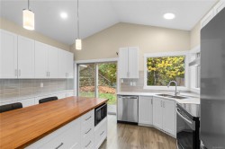 Fantastic family home walking distance to syuwenct (previously Coal Tyee) Elementary. The open-concept main level is ideal for families and entertaining, featuring 11' vaulted ceilings, an updated kitchen with tons of storage, ample dining space, and a cozy gas fireplace in the living area. Sliding glass doors open onto a super private back patio and yard space, perfect for hanging out around the firepit. The spacious primary bedroom features a huge deep-set window for space and light and a full 4pc ensuite, while the oversized bedroom/den combo can easily be converted back to 2 separate bedrooms with original door and wall framing still in place. The lower floor offers 2 more bedrooms plus another den/office (for a total of 6 potential sleeping rooms!), a family room and 3pc bathroom, providing a great layout for potential secondary suite or in-law accommodation. Located in a great family neighborhood close to Beban Park Rec Centre and the amenities of the Bowen corridor.