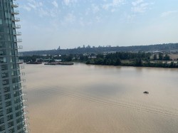 Welcome to this Iconic Waterfront Development. Stunning 2 Bed 2 Bath unit with unobstructed views of the Fraser River. This unit features floor-to-ceiling sound-proof windows, A/C, and premium finishes throughout. The kitchen is equipped with Bosch appliances including a gas cooktop stove & waterfall countertops. Both bedrooms offer generous closet space and natural light, including a walk-in closet in the master bedroom. The bathrooms showcase modern tiling, Nu-heat heated floors, and a beautiful glass-enclosed shower. Enjoy a well-sized balcony, in-suite laundry, storage locker & parking spot included. Residents of Pier West have access to over 10,000 sq. ft. of world-class amenities, including a fully equipped gym, outdoor lounge areas with BBQs. Steps to SkyTrain, shops, & dining!