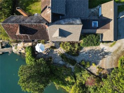 Enchanting two-acre waterfront, complete with its own private dock, stables, cottage, & orchard. Steeped in history and brimming with potential, this property offers endless possibilities. Subdivision potential or enjoy a serene private oasis.The moment you arrive, you'll be captivated by the English country charm of the architecturally designed home. Crafted by renowned architect Hubert Savage for the Tryon family in 1934, the house sits proudly on a southern bluff, offering interesting water views. Step inside and imagine the stories this home could tell of wonderful social gatherings and cherished family moments. Lovingly maintained by the same family for 50 years, a perfect setting to expand your life and bring your creative projects to life.The outbuildings, currently used as pottery and weaving studios, can easily be converted back to hobby farm use or adapted to suit your vision. Embrace the chance to own a piece of history and create your legacy in a truly magical setting