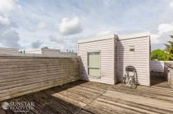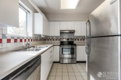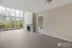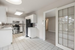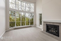 This unique 1,249sf northeast-facing, 2-level penthouse features 2 bedrooms + den, 2 bathrooms, 2 covered balconies, a private rooftop deck, and access to a large communal deck. Recent updates include new laminate floors and fresh paint throughout. The grand living room boasts 17’ ceilings, floor-to-ceiling windows, and a gas fireplace. The spacious dining area connects to the upper level, while the tiled kitchen includes a breakfast nook, balcony access, white cabinets, and stainless steel appliances. The primary bedroom offers a 4-piece ensuite and balcony access. Upstairs, the open den overlooks the living room, has a closet, and opens to the rooftop deck with Garden City Lands views. Rent includes 1 parking stall and storage locker. Max 2 unrelated occupants.
