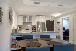 This spacious 639sf, 1-bedroom plus office unit features laminate floors and high ceilings throughout. The open living area leads to a covered balcony and an adjacent dining area with a ceiling light fixture. The gourmet kitchen offers glossy white cabinets, a serving island with breakfast bar, stone countertops, tiled backsplash, pot lights, and stainless steel appliances including a gas cooktop. The bedroom has two large windows overlooking the balcony. The elegant 4-piece bathroom features floor-to-ceiling tiles, marble-style flooring, a stone countertop, and a soaker tub with shower. The large office fits a full-size setup, and the oversized laundry room includes front-load washer and dryer. The in-suite heat pump provides year-round comfort. One parking stall is included.