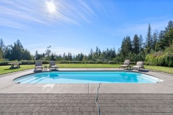 Beautiful 9.54-acre equestrian estate in desirable Roberts Creek. Panoramic ocean views, privacy and a turnkey country lifestyle. Formerly a dahlia farm with orchard, berries and greenhouses, it could easily regain farm status. The custom 5BR home features meticulous craftsmanship—Brazilian cherry floors, cherry cabinetry, granite counters, double ovens, butler’s pantry and formal + casual living. Covered balconies capture sunsets, while the walk-out lower level opens to a 32’ heated pool, hot tub, fenced yard and summer kitchen with suite potential. Equestrian facilities include an overheight 3-stall barn, turnout, training paddock, huge workshop and a fully self-contained 2BR suite above for income or staff. 3-car garage and dog run add convenience. Luxury, horses and coastal living!