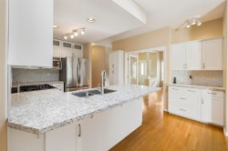 Superb 55+ half-duplex style end unit in a private, friendly 16-unit complex surrounded by majestic trees. 2281 sqft. bright, open layout with vaulted ceilings & skylights, ¾” hardwood, upgraded kitchen w/ Caesarstone & marble backsplash, gas stove, dream ensuite, hot water on demand & A/C. West-facing cedar deck & gardens. 2 bedrooms on & den on main + huge flex room upstairs & double car garage. You won’t be disappointed!