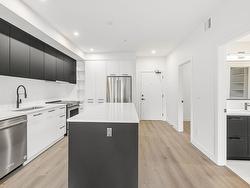 Welcome to Odyssey by the award-winning Forge Properties! This stunning 2-bedroom home features an open-concept layout with full-sized stainless steel appliances, sleek black matte plumbing fixtures, and elegant white quartz countertops complemented by a white tile backsplash. Enjoy the privacy of your own balcony and the warmth of wide-plank wood-grain laminate flooring. Additional highlights include a Whirlpool washer & dryer, rough-in for air conditioning, and a designated parking spot with a storage locker. Residents have access to a state-of-the-art Health & Fitness Centre with a sauna and fully equipped lounges. Ideally situated just off King George Blvd & 152nd St, this home offers convenience with nearby amenities, transit, highways, parks, schools, and a short drive to the beach!