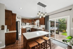 GORGEOUS Well Maintained 2 Storey w/FULLY Finished Bsmt + Sep Entry offers 5Bdrms/4Bths. Bright open main feats vaulted ceilings in Living & Dining rooms, custom built-ins & beautiful laminate. Island kitchen is complete w/SS appliances, Chef-worthy Gas stove & hood range, quartz counters w/under mount sink, Subway tile backsplash & new dishwasher. Lots of natural light w/large windows in family room. Generous Primary offers 4pc ens w/soaker tub & sep shower. F/finished Bsmt is easily suited for extra income. Heat pump acts like AC + built-in vacuum. Private f/fenced b/yard comes w/custom covered deck + BONUS patio & built-in fire pit! Updated furnace & HW tank too! Close to shopping, schools & parks. Great family neighbourhood! Easy to show!